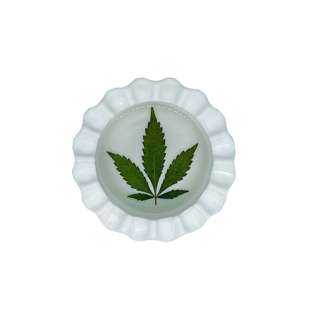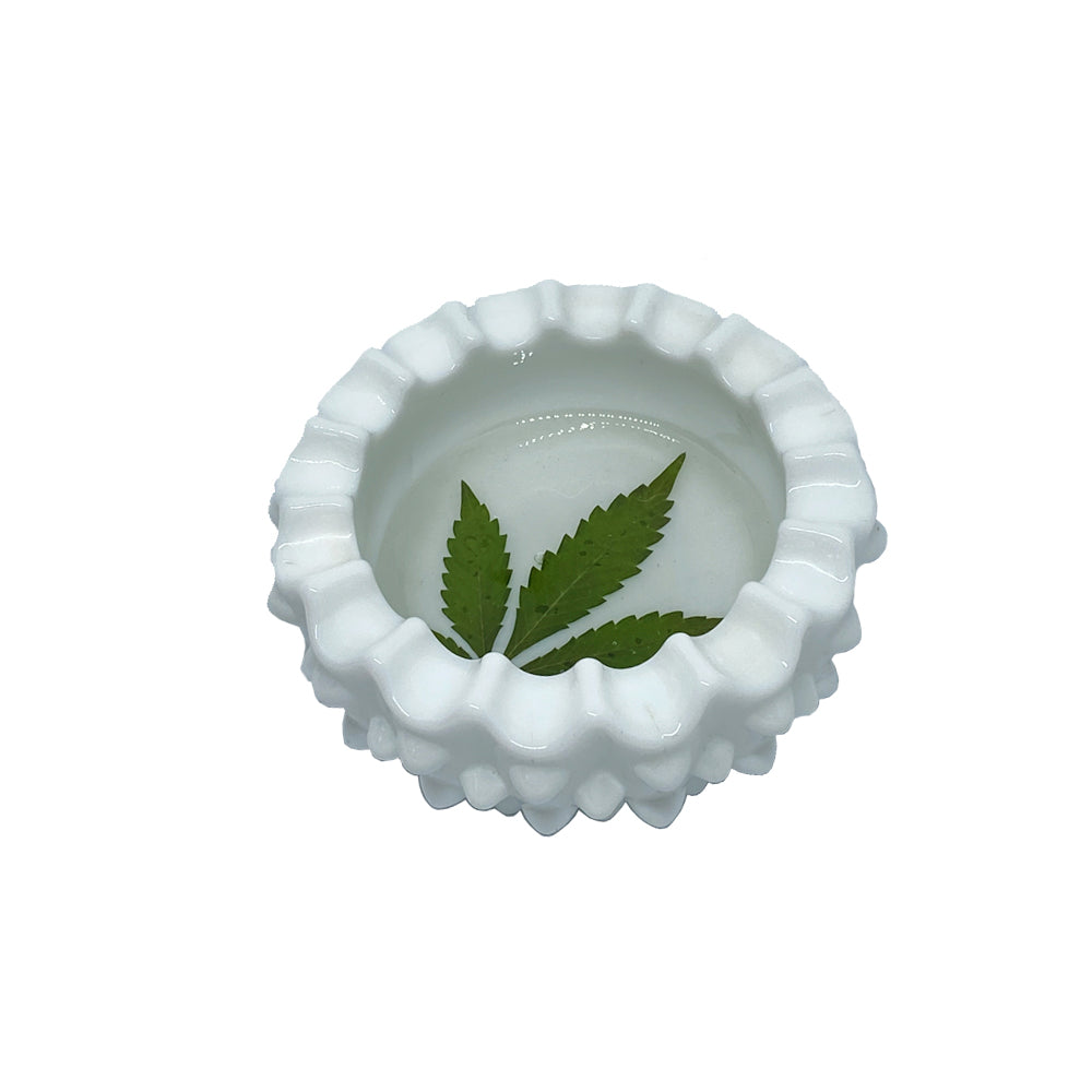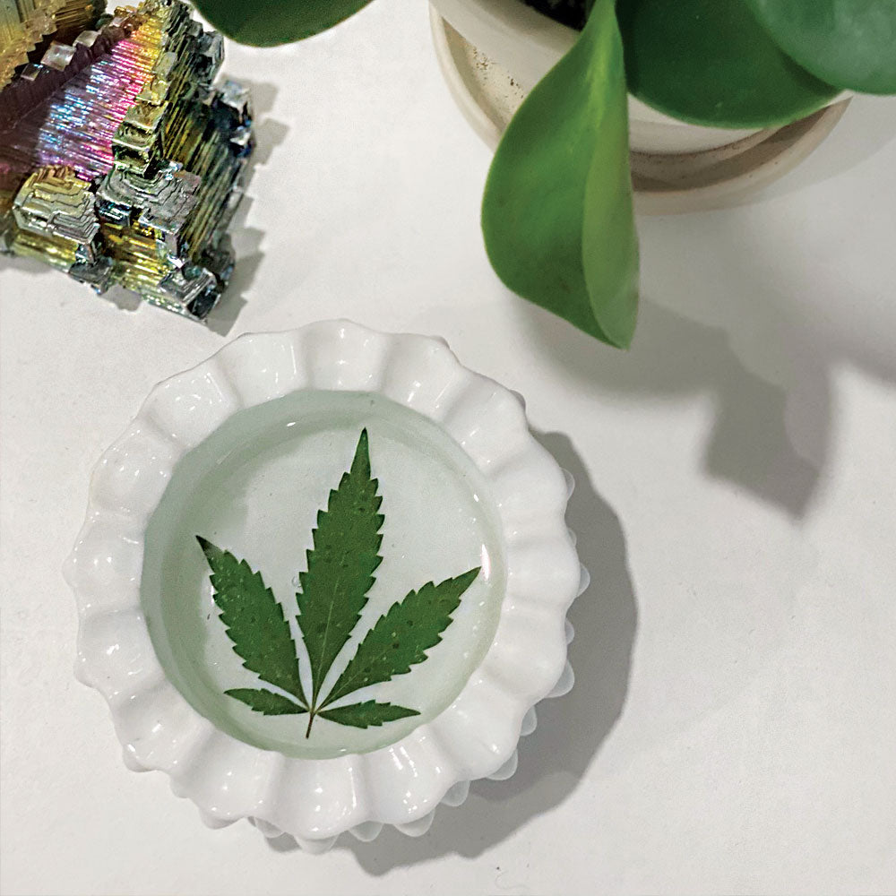 This little antique milk glass ashtray is not your grandma's ashtray. It might have been your grandma's ashtray at one time, but I revived it with a leaf from my favorite plant.